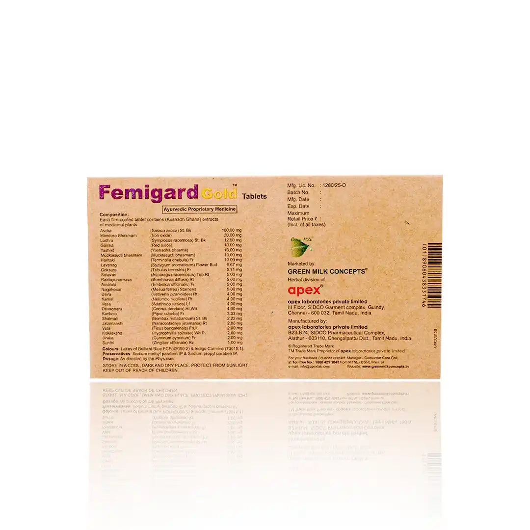 Femigard Gold Tablets by Green Milk Concepts is an Ayurvedic formulation designed to support women’s wellness across different life stages. The blend combines classical herbs such as Ashoka, Lodhra, Shatavari and Jatamansi along with Mandur Bhasma, Gairika and Yashada Bhasma, which are traditionally used in Ayurveda to support menstrual comfort, hormonal harmony and reproductive system balance.