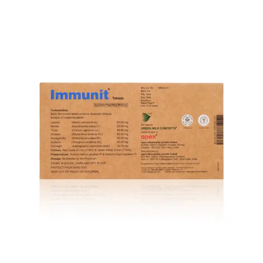 Immunit Tablets is an Ayurvedic immunity formulation designed to support the body’s natural immune response and overall daily wellbeing. The blend combines time-honoured herbs such as Guduchi, Tulasi, Kalmegh, Nimba and Lasuna, along with Amalaki and Ashwagandha, which are traditionally used in Ayurveda for immunity, vitality and resilience.