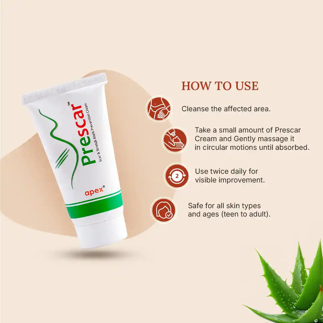 This ointment for stretch marks and scars works by deeply nourishing the skin, improving elasticity, and supporting natural regeneration. With Ayurvedic actives like Gotu Kola, Manjistha, Turmeric, Aloe Vera, and Vitamin E, Prescar helps visibly improve the appearance of stretch marks, accident scars, acne marks, and uneven pigmentation over time.