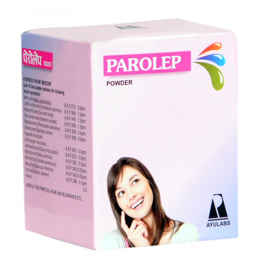 Parolep powder is balanced combination to treat pimples, acne blemishes, wrinkles, scars, scratches and black heads. It saves from skin eruption and other unwanted growth on the face Parolep powder is effective in cosmetologic problems arising from using the cosmetics, foundations and soaps manufactured from spurious chemicals, dyes and oil cakes.