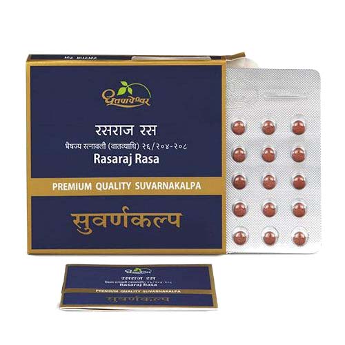 Dhootapapeshwar Rasaraj Rasa Premium Quality Gold contains Rasasindoor, Abhraka Bhasma, Suvarna Bhasma, Loha Bhasma, Roupya Bhasma, Vanga Bhasma, and Ashwagandha as active ingredients.